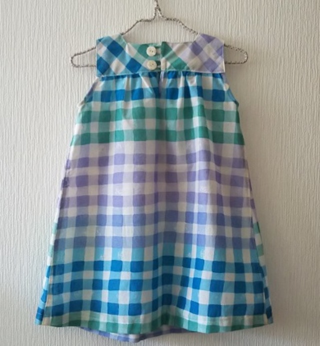 東京・和布洋裁屋 atelier tuitui 作 麻混ふんわりワンピース サイズ100cm 素材 麻15% 綿85% 白地にブルーとグリーンとパープルのギンガムチェックが爽やか♡